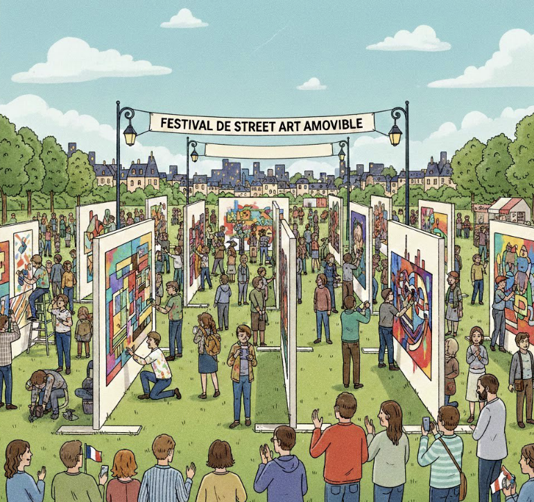 Nous organiserons le festival de street art temporaire, avec des œuvres réalisées sur des toiles tendues entre les arbres ou sur des supports mobiles.